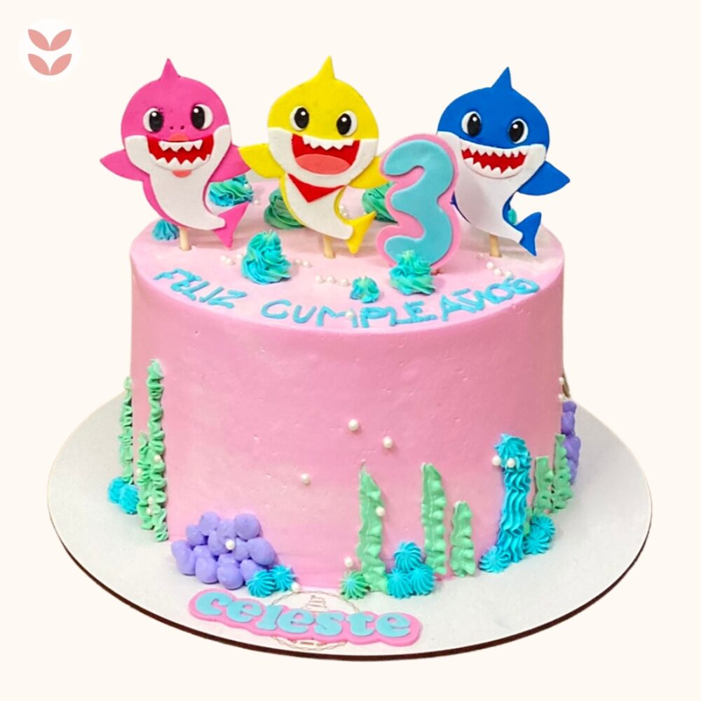 ¡Celebra tus cumpleaños con nuestra deliciosa torta personalizada en crema con los tiernos Baby Shark. Tiene láminas de azúcar, cubierta en ganache de chocolate y con figuras 100% comestibles y sin conservantes.