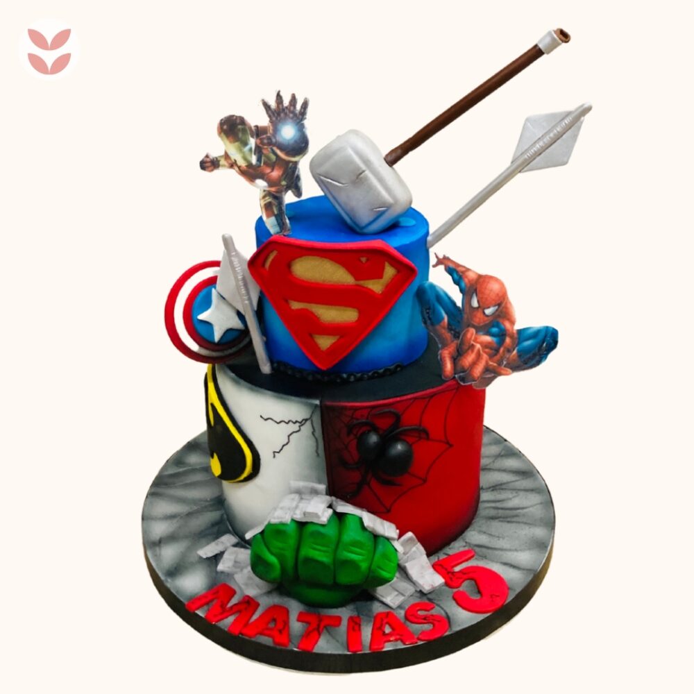 ¡Haz que tu evento sea memorable con nuestra torta personalizada de súper héroes! Con figuras 100% comestibles y sin conservantes, nuestros ponqués son suaves y deliciosos, lo que hará que tus invitados quieran más.